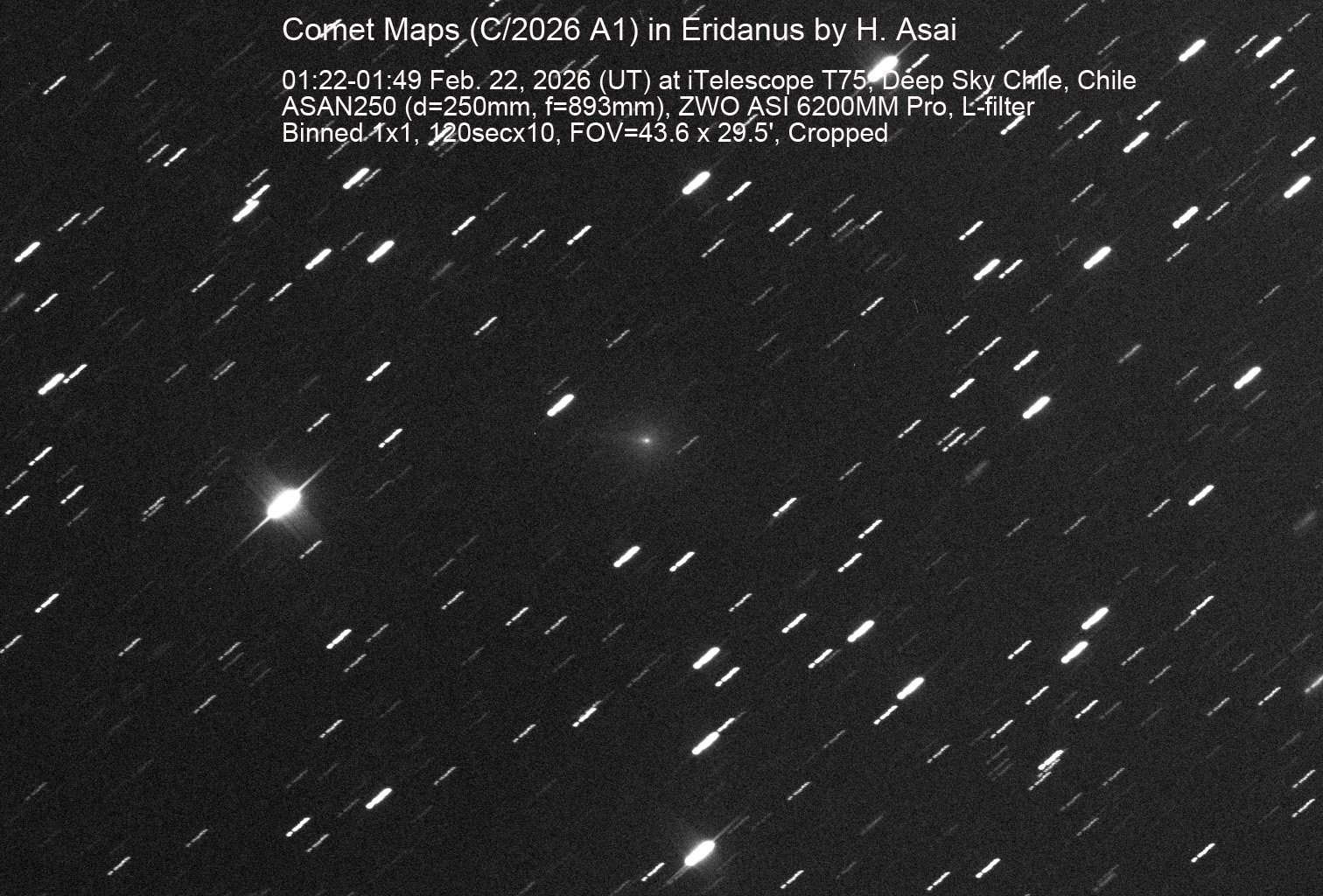 今、話題の太陽に接近するクロイツ彗星のMAPS彗星をチリのリモート望遠鏡で撮影しました。今は17.3等と暗く、微かに尾が東へ伸びているのがわかります。北西へ109"/HRで移動しています。近日点通過は4月4日です。