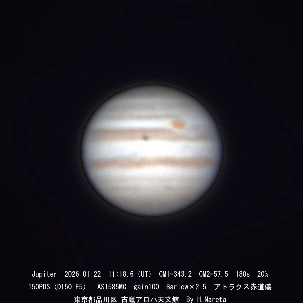 1月22日の木星です。 1月の蓼科合宿で,HAさんから木星撮影のアドバイスをいただき、自宅で撮影しました。 シーイングは悪くなく、中ぐらいでした。