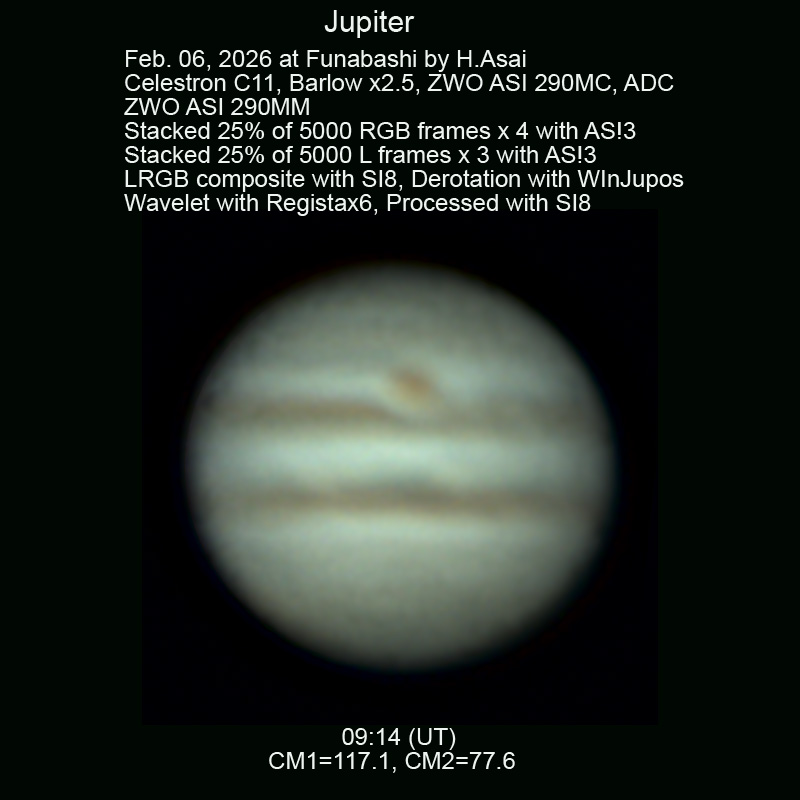 久し振りに冬型の気圧配置が崩れて気流が安定しているかと思ったのですが、シーイングは悪く、木星がモニターの中で踊っていました。また、L画像とRGB画像のLRGB合成を行ったのですが、効果はほとんど出ませんでした。画像の中央に大赤斑が見えます。