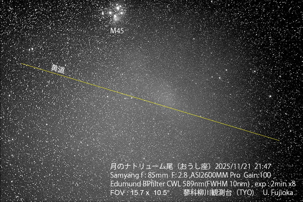 ナトリュームの光は昔よくトンネルの照明使われていた黄色い光(589nm)です。この光だけを通すナローバンドフィルタを付けて撮影しています。