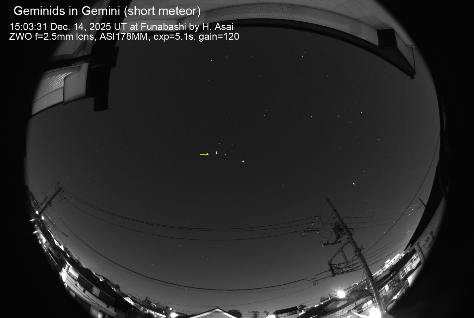 2025 12/14 15:03:31 (UT) ふたご座の放射点の近くのため短い軌跡です。