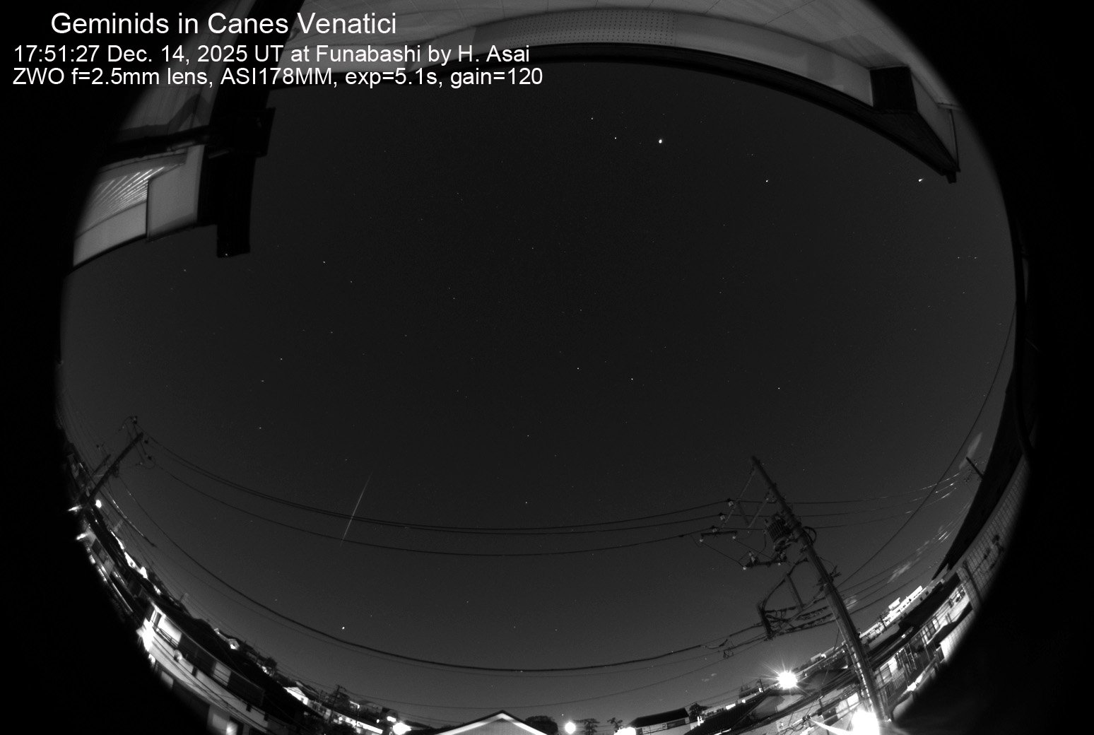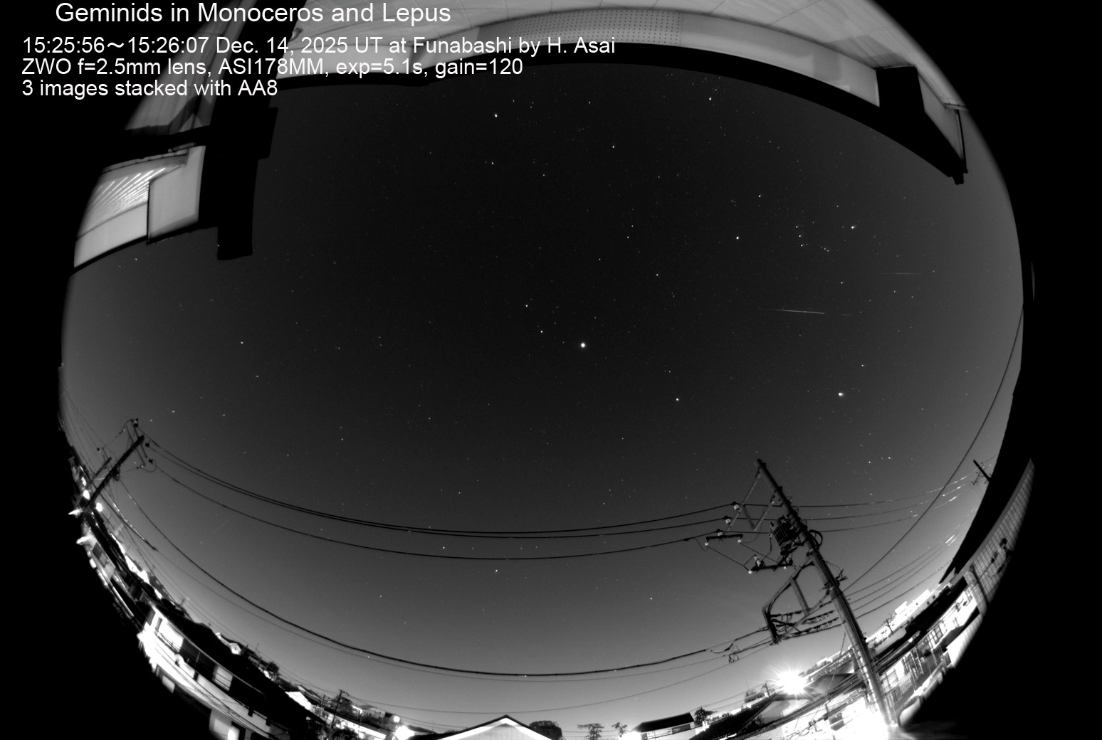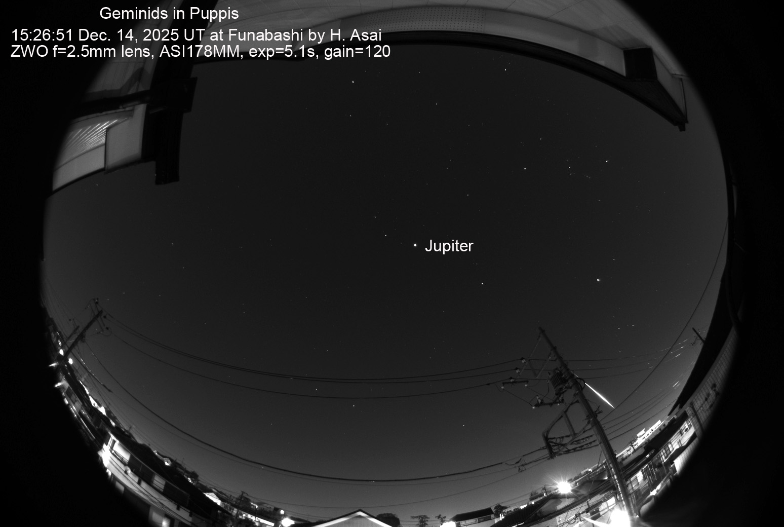 2024 12/14 15:26:51 (UT) もっとも明るかった流星です。電柱に少しかかっていますが、とも座を通過しました。