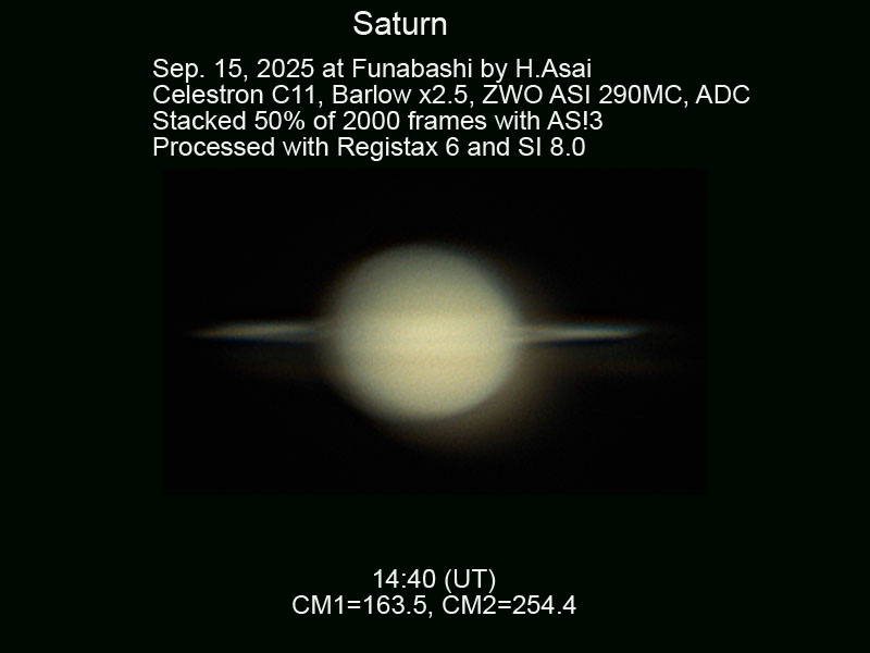 土星の衝が近づいており、Celestron C11を惑星撮影モードに切り替えて、15日から土星を撮影しております。ここのところ風が強くシーイングがよくないのであまり良い画像ではありませんが、参照ください。従来通り画像の上が南です。土星の衛星が周辺に見えるはずですが、明るさの差がありすぎて撮影は難しいです。また、衛星の土星面通過が頻繁にありますが、これもシーイングとの勝負で、木星のガリレオ衛星と異なり、中々難しいテーマです。
