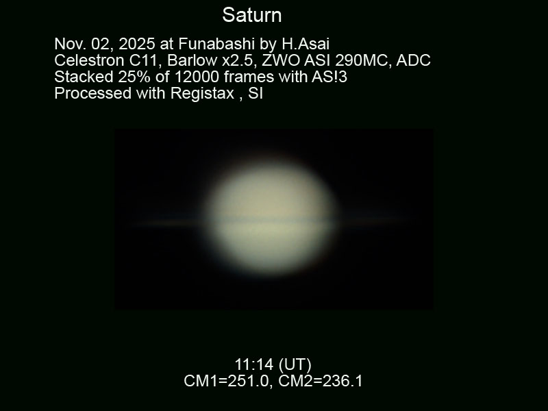 自宅で撮影した土星画像です。11/1は薄雲越しでの撮影で、11/2は月が近くにありましたが、比較的シーイングが良かった状態でした。参考のために、WinJuposの画像も添付します。環がほぼ一直線です。