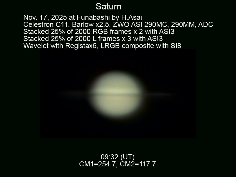 11/16と11/17の土星画像です。11/16は11/15と同様に良いシーイングでしたが、11/16はまた悪くなりました。何れにしても環はほぼ一直線です。
