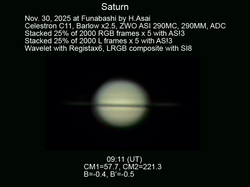 土星の環の開きは11/24に最小になり、これから徐々に開いていきます。参考のために、地球から見た土星の緯度(B)と太陽から見た土星の緯度(B')をCaptionに追加しました。3月に環が消失した時は、Bの値が0でした。次に環が消失するのは14年後の2039年です。